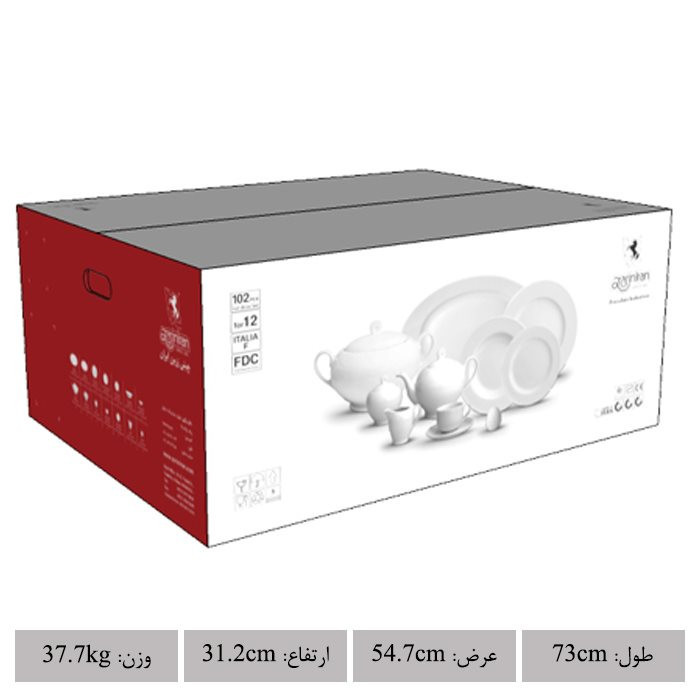 این سرویس ۲۸ پارچه است و شامل اقلام زیر می شود : سالاد خوری کوچک: شش عدد دیس: دو عدد بشقاب غذا خوری: شش عدد بشقاب خورش خوری: شش عدد بشقاب میوه خوری: شش عدد نمک پاش: دو عدد