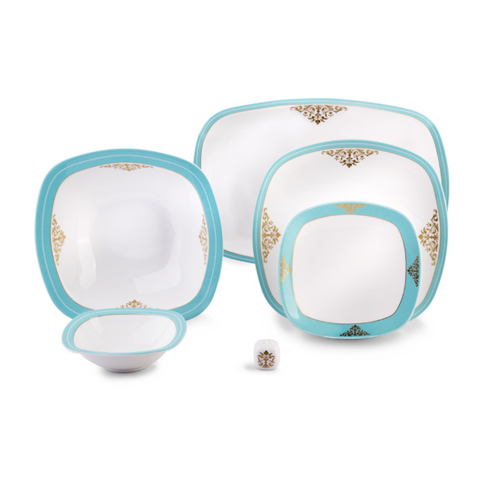 سرویس غذاخوری 27 پارچه چینی زرین ایران سری کواترو مدل حاشیه ارمیتاژ فیروزه ای درجه عالی