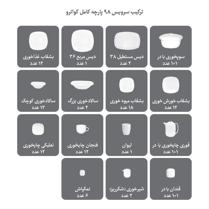 با نگاه به سبک مدرن زندگی امروز، یک طراحی چهارگوش هوشمندانه و جذاب با تکیه بر نهایت سادگی و در عین حال حداکثر کارائی، ظروف چینی کواترو را به وجود آورده است.