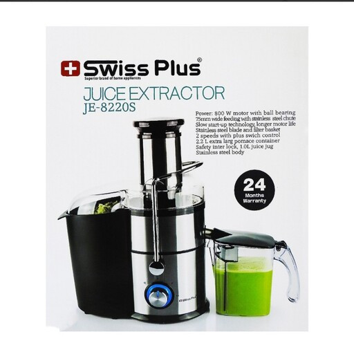 آبمیوه گیری سوییس پلاس مدل JE-8220S موتور قدرتمند: 800 وات با مصرف انرژی +A، جنس بدنه: استیل، دارای دو سرعت آب گیری و عملکرد سرعت لحظه ای، دارای سیستم محافظ حرارتی موتور و سوئیچ ایمنی ،دارای سیستم ضدچکه، با ظرفیت ۲.۲ لیتر برای نگه داری پالپ، مجهز به پایه ضدلغزش ،دارای قابلیت آب گیری میوه کامل، نظافت آسان متعلقات و بدنه ،دارای فیلتر استیل ضد زنگ با دهانه ای به قطر 7.5 سانتیمتر