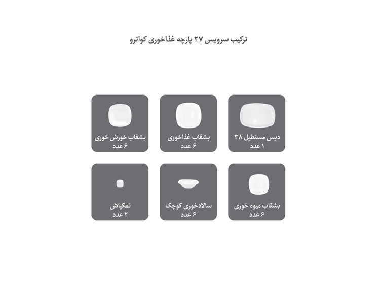 با نگاه به سبک مدرن زندگی امروز، یک طراحی چهارگوش هوشمندانه و جذاب با تکیه بر نهایت سادگی و در عین حال حداکثر کارائی، ظروف چینی کواترو را به وجود آورده است.